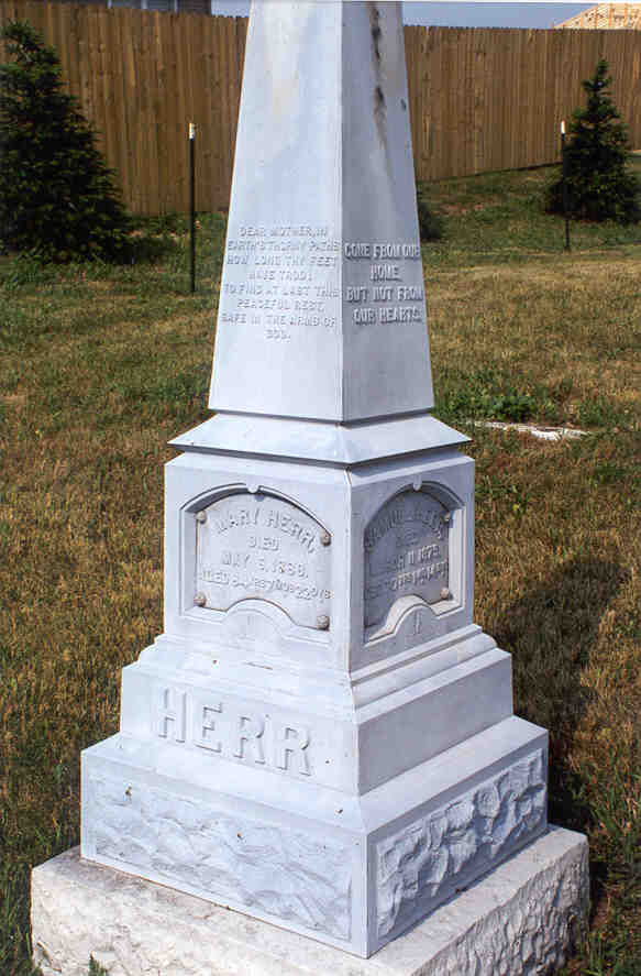 The cemetery is located in what was Randolph Township, north of Englewood, Ohio. Coordinates are SW 1/4 Sec 9,T5, R5E, North side of road, 800' east of Martindale Road. The area surrounding the cemetery is now a housing project and efforts have been made to preserve what remains. The cemetery was the old Warner Family Cemetery, but later publications refer to it as the Herr Cemetery.