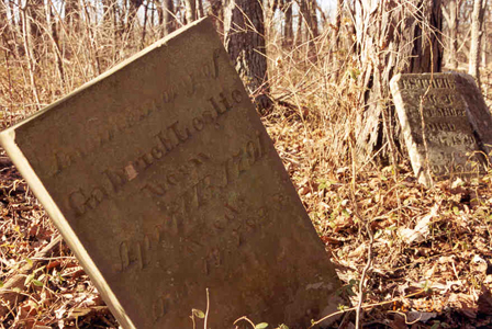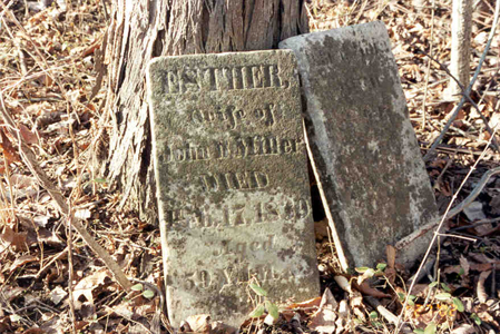 According to Roger Rhodes, "it [Leslie Cemetery] is located on land homesteaded in 1814 by my ancestors, Jacob and Phillip Rhoades, after having come to Montgomery Co. from Bedford Co., PA in 1810. Though I myself have not seen the stones, I suspect the German stone that is in pieces is the one that reads, "(Hier)\Ruhlen (die Gebeine)\Von Maria Roth\Ehegattin von Philip\Roth. Starb April 18\1838. Alter 62 Jahres". The words inside the ( ) are on the missing pieces and are assumed based on German custom. In English it reads: (Here)\rests (the body)\of Maria Roth\wife of Philip\Roth. Died April 18\1838. Age 62 years. This is Mary Weaver, wife of Phillip Rhoades (1769-1848) whose grave has not been found. I strongly suspect his grave is somewhere near Mary's but has sunken."